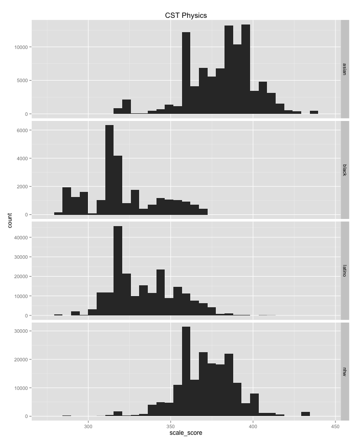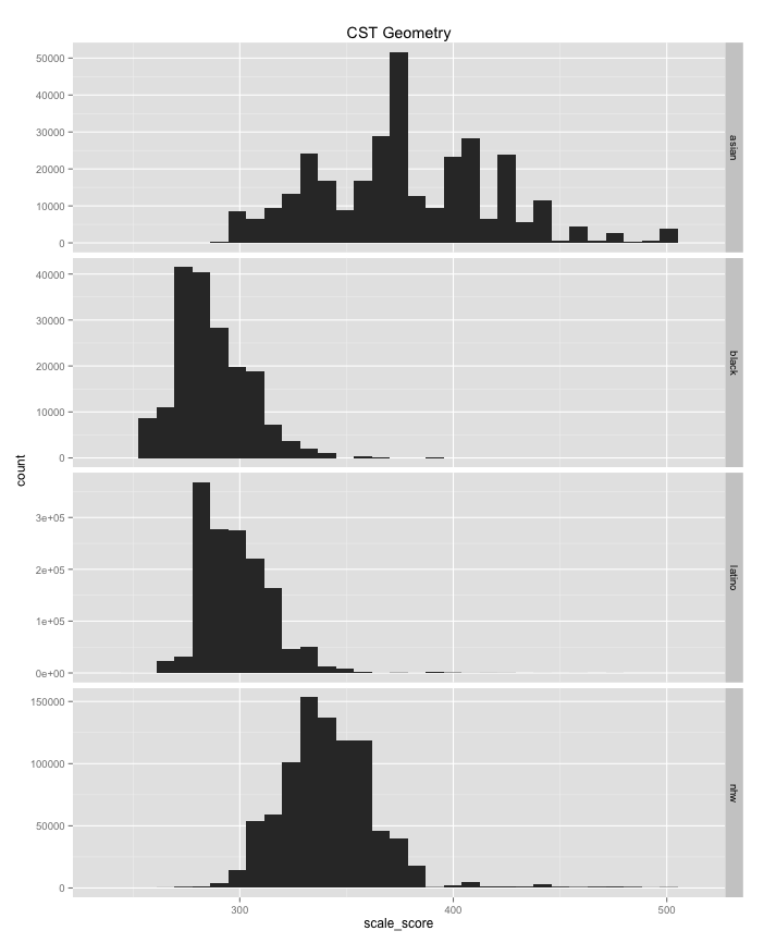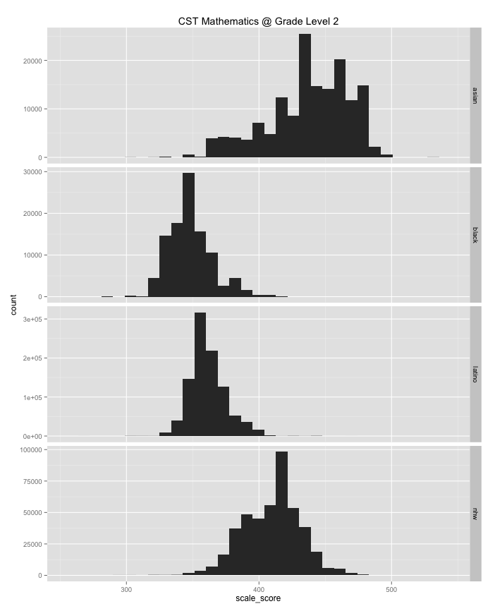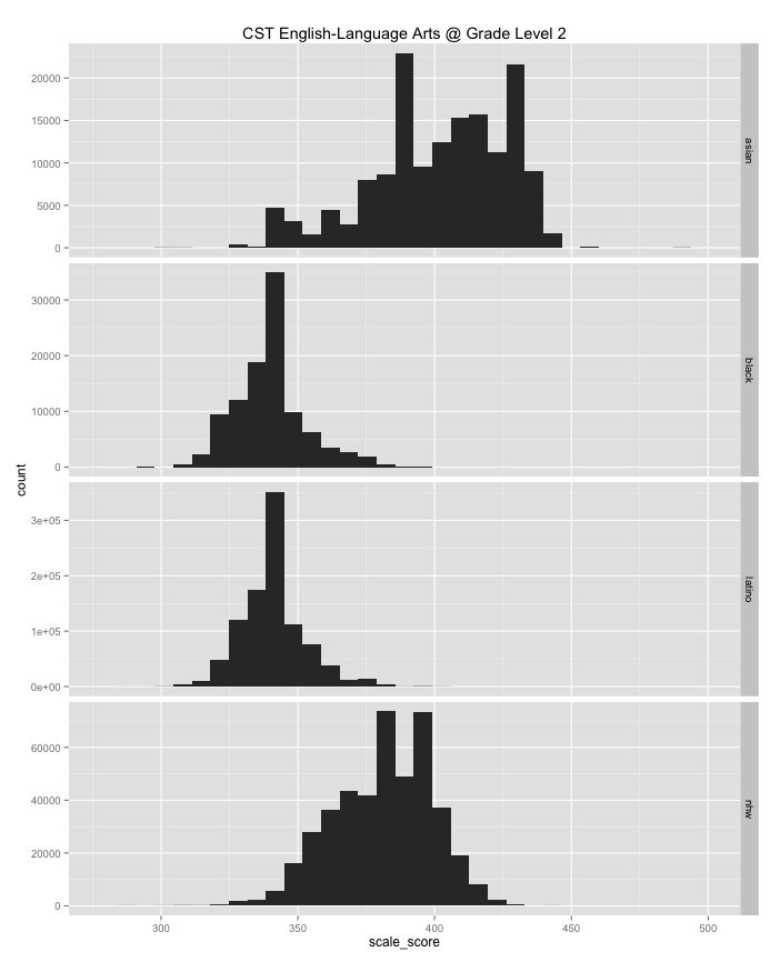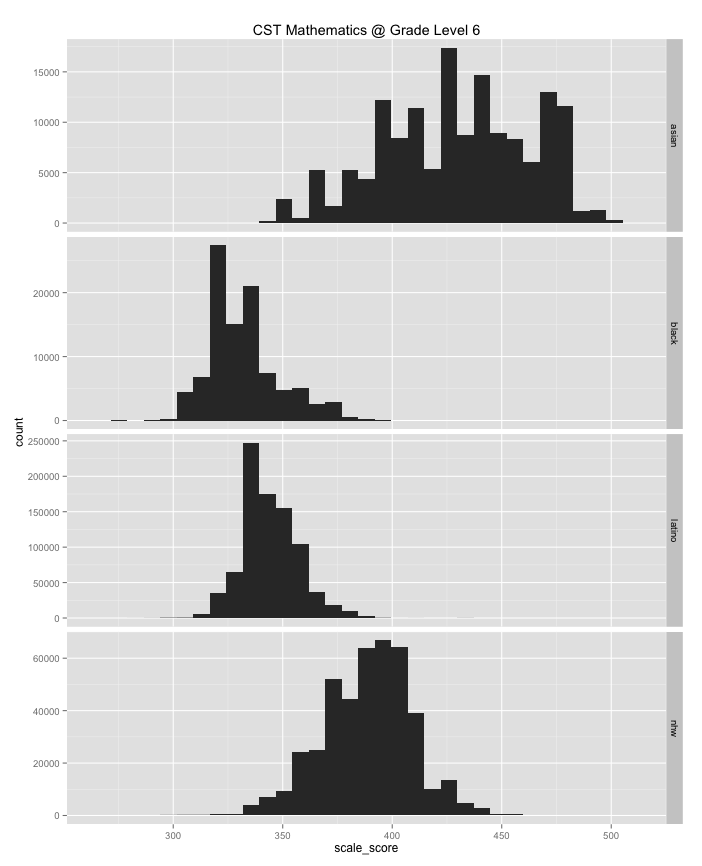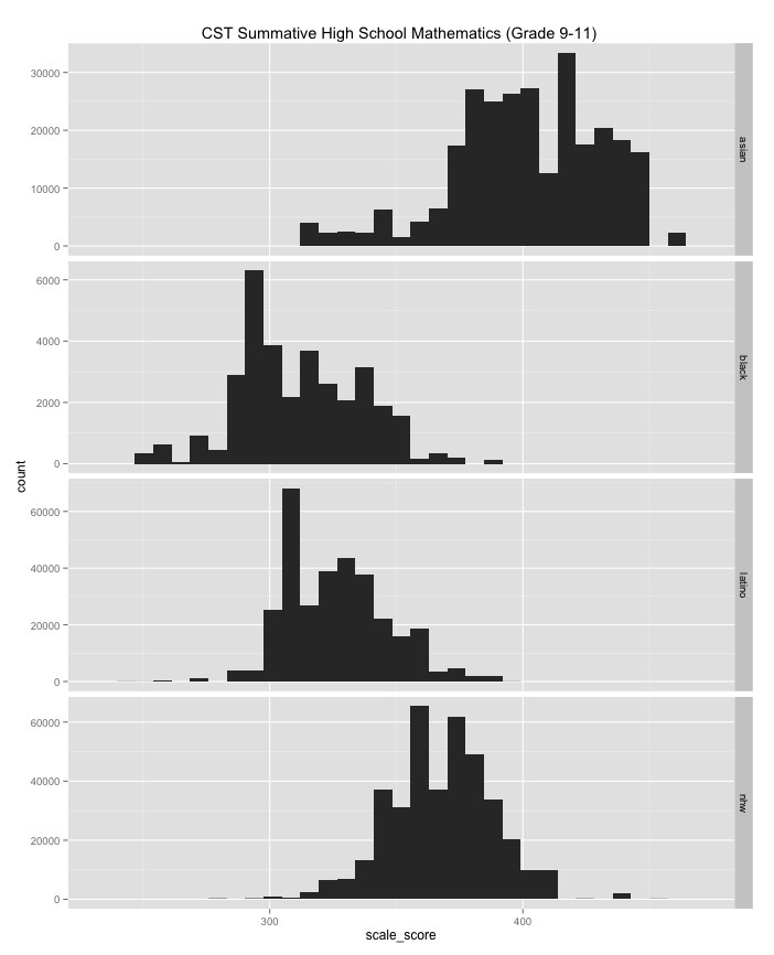 Also note that even if you filter these histograms by income or poverty rates there are still large achievement gaps between groups.