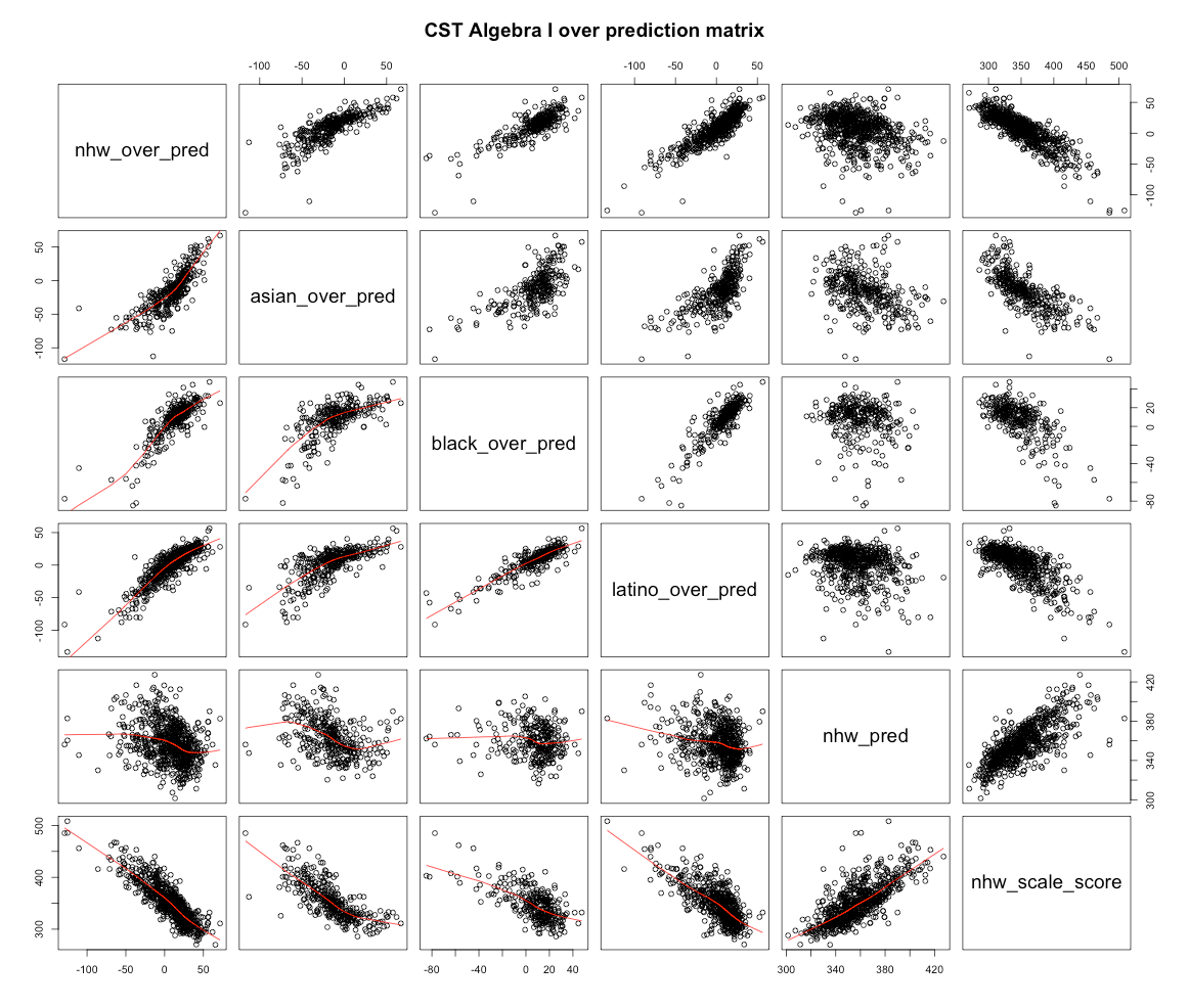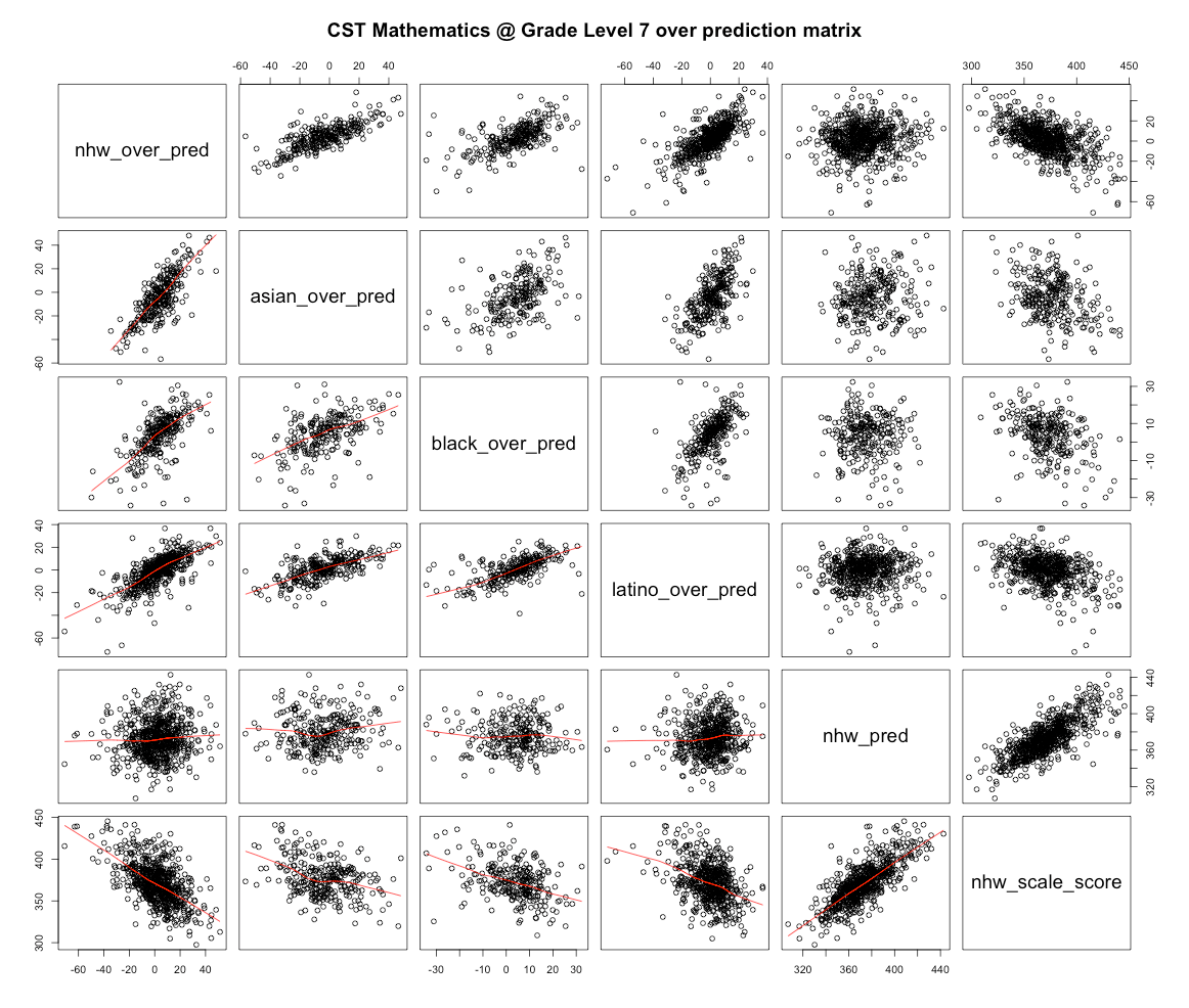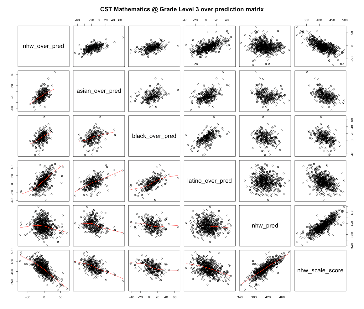 If we try to predict each groups scores by school district based on race/ethnicity and SES indicators with a simple linear model we can roughly approximate the patterns we find. However, if you look at each group separately you’ll notice that groups that perform better overall tend to be out perform as they move towards to the right.