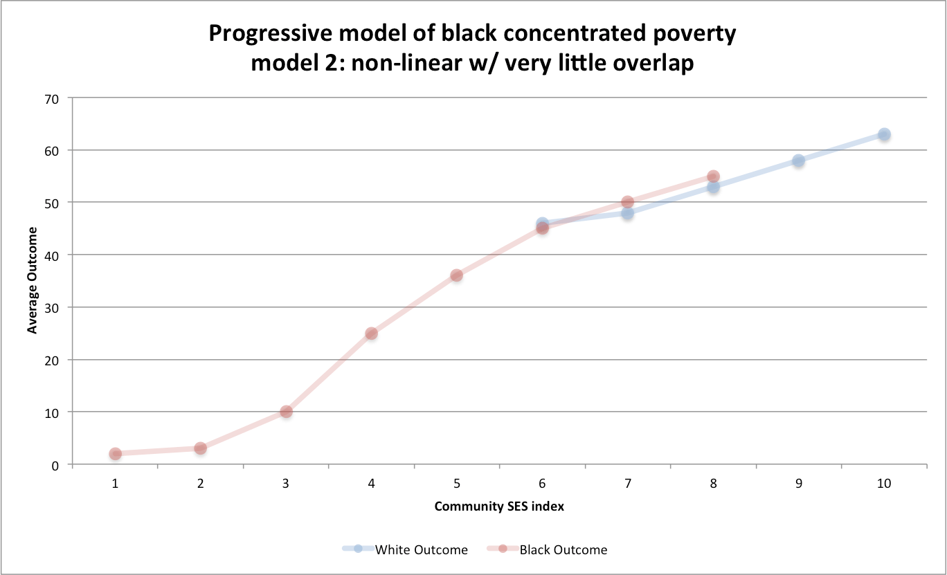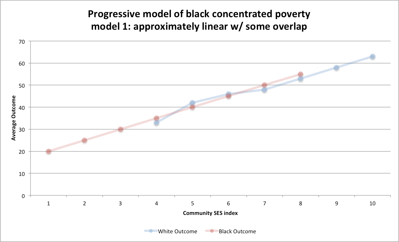 The reason is that these models are applying fixed effects for race/ethnicity and adjusting all groups the same for each increment in SES (education, median family income, etc). If the concentrated poverty thesis were true, we’d expect to find the opposite, as in, the black slope ought to be greater than the white slope.