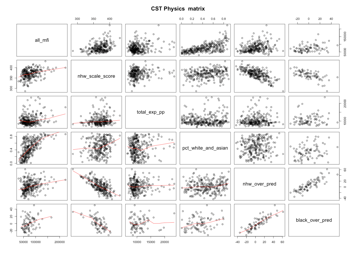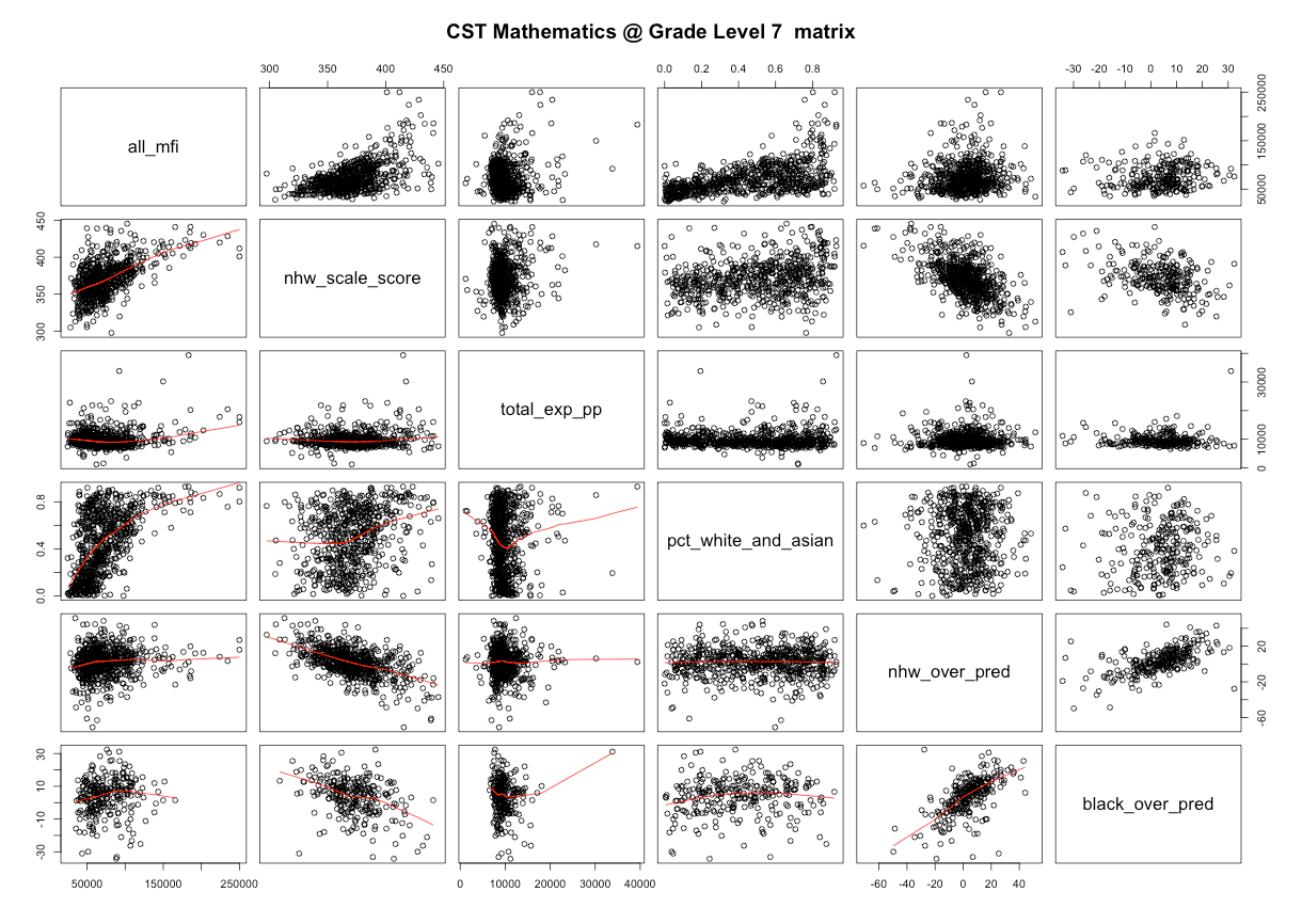 To save time and space, I graphed all of the CST tests (including some of the silly ones w/ insufficient) by median family income, poverty rates, and percent college education in *big* PDF documents (~90 “inches” tall). It’s not pretty, but you can see that I’m not just cherry picking.
