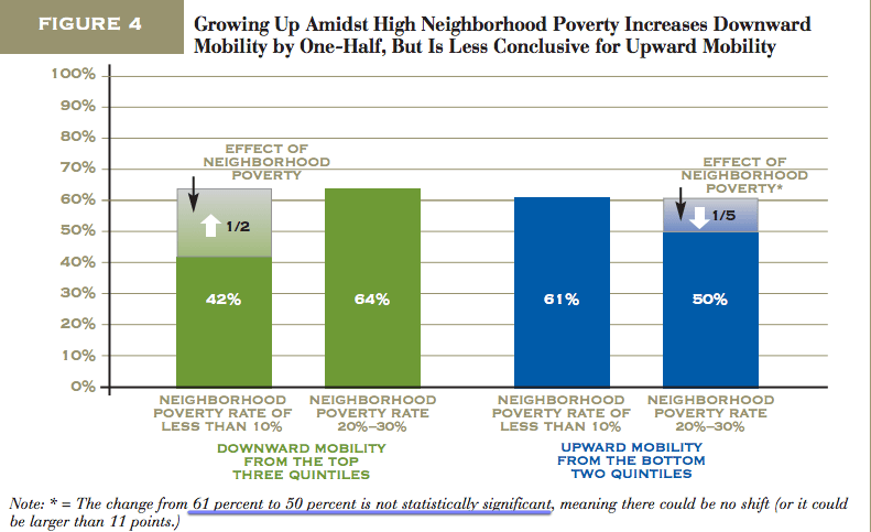 Despite the fact that the report made some sweeping claims about the effects of concentrated poverty, the actual observed mobility differences are modest and not even statistically significant. Their binning method by income quintile and neighborhood poverty decile(ish) is also likely to overstate these differences and this potentially observed difference cannot even be reasonably argued to be an “effect” because they made no attempt to control for background characteristics.