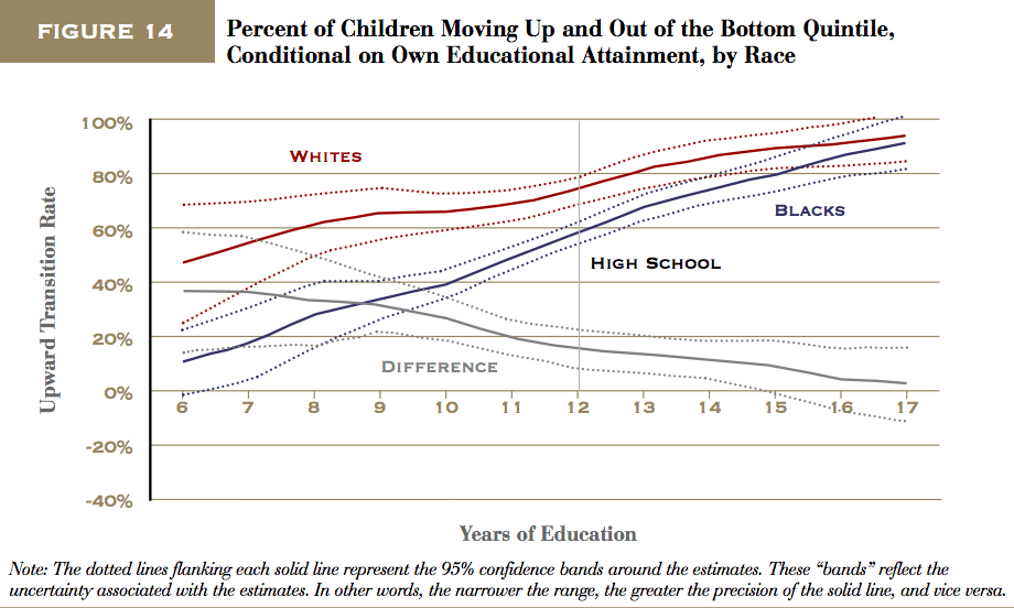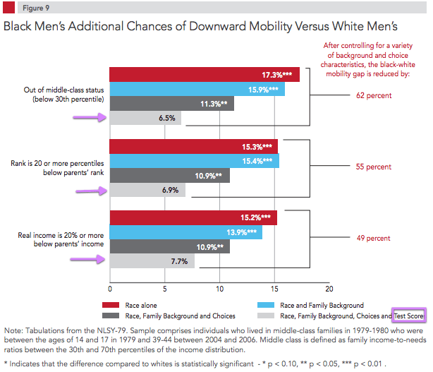 Fourth, there is substantial evidence that the test score differences themselves mediate almost the entire economic mobility (or income) gap between blacks and whites. The difference in poverty rates are largely a symptom of differing income and employment levels.