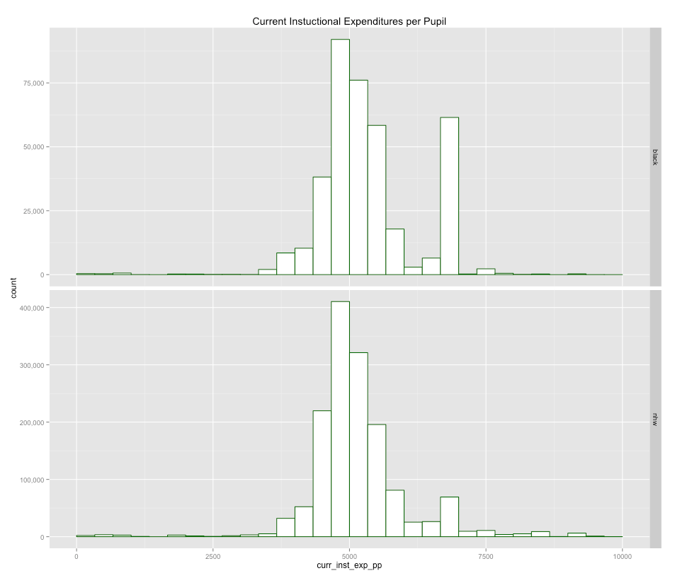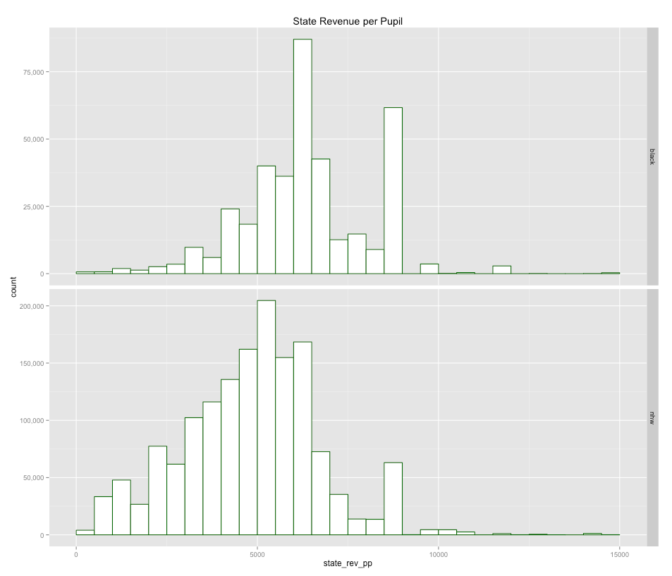 Below are a bunch of histograms I generated at a school district level for some presumably important statistics in California. Some may not think these speak to possible school level disparities within districts (especially large cities), but they certainly can help rule out the notions like the belief that there are vast funding disparities between dense urban areas and the surrounding suburbs (or differences in teacher “quality”, class size, etc) or complete lack of overlap in school characteristics. Generally speaking very few of these statistics favor whites and almost none of them consistently so.