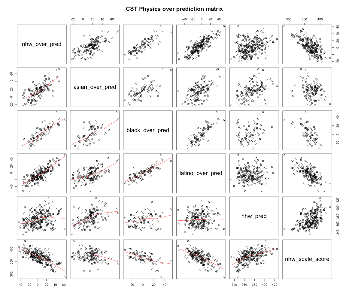 Again, since this model is generalized for all tests and all groups some predictions are consistently skewed under- or over- to some degree. More specifically, there is systematic error in the model with respect to race & SES with some particular tests due to the exclusion of interaction effects, varying test taking rates, etc. This error is generally inversely related to how well correlated the test is in the model (see table the median family income column in the table below). In other words, it is appreciably off in both the group intercept and slope with some particular tests. You might notice, for instance, that higher median income is correlated with over-prediction in physics for both whites and blacks.