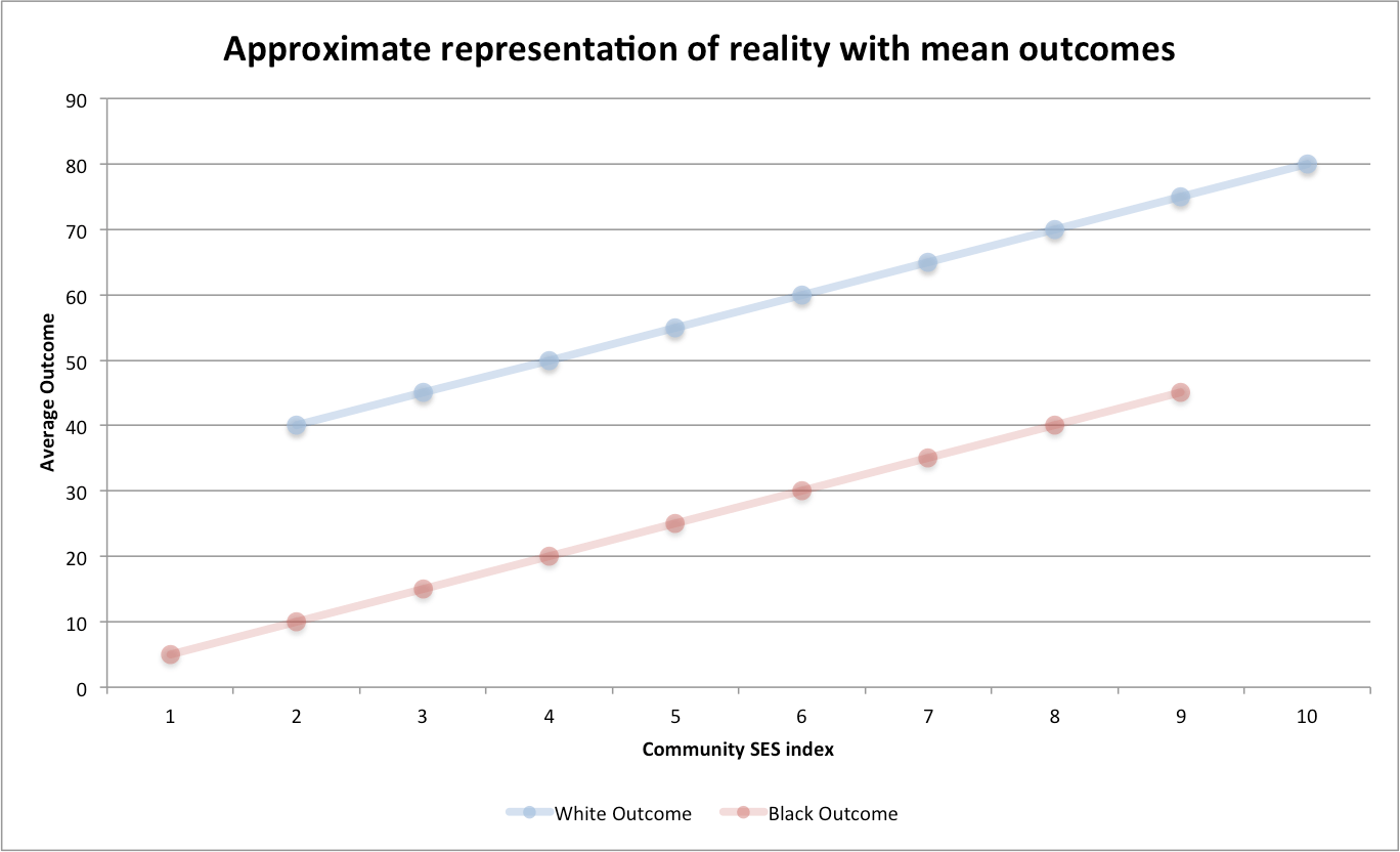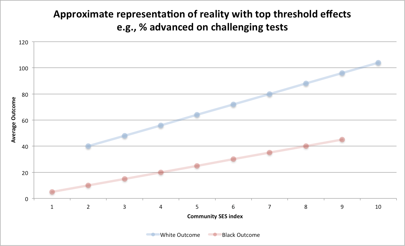 Presumably the relationship between the actual neighborhood-level SES, as measured by poverty rates, income levels, education levels, etc, and academic outcomes should look something like this: