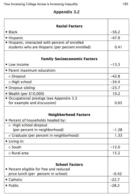 If they truly believe that wealth per se has such a large effect on school quality and they believe that school “quality” actually has such profound effects, then adding these other variables in and reducing the resolution of other popular correlates is a terrible choice. People sort into neighborhoods and pick peer groups on the basis of race, class, and more and just because neighborhood lets you make some strong predictions about the individual does not mean that those neighborhoods or, especially, the schools in them actually cause those differences.