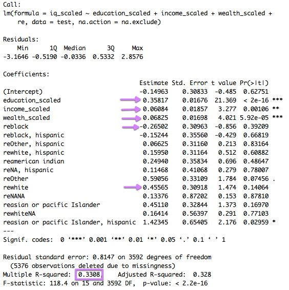 Although it is true that the race/ethnicity differences are not statistically significant (not enough power w/ all of these other variables), the actual coefficients are quite large (it’s worth bearing in mind that these B-W differences are consistent with many other studies). A 1 SD increase in wealth, about $137K, corresponds to about a 0.06 SD increase in IQ… that’s pretty trivial in my book.