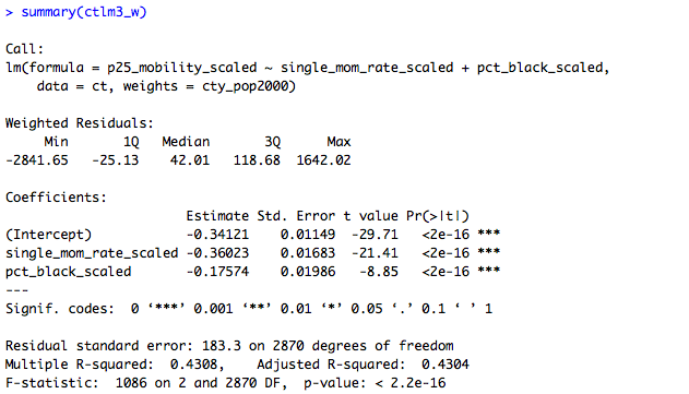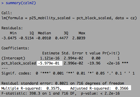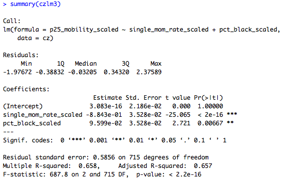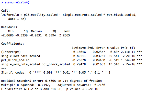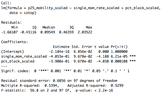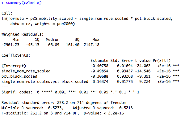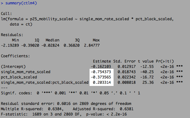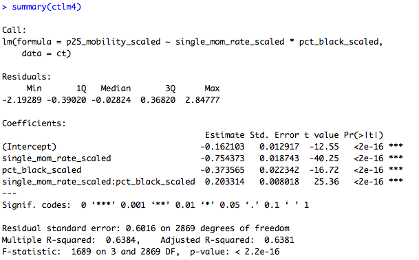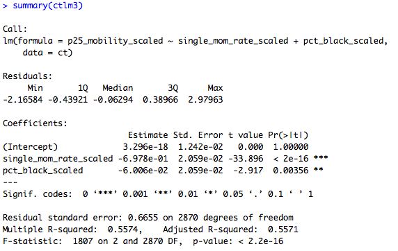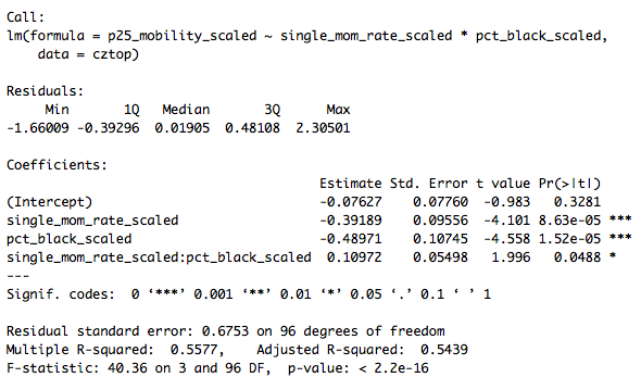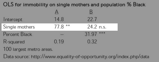 This shows that the association between single motherhood rates and immobility is reduced by two-thirds, and is no longer significant at conventional levels, when percent Black is added to the model. That is: Percent Black statistically explains the relationship between single motherhood and intergenerational immobility across U.S. labor markets.