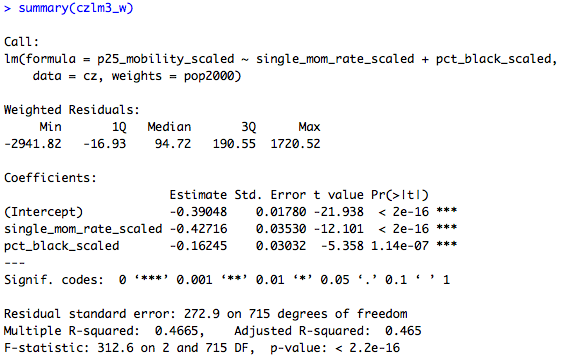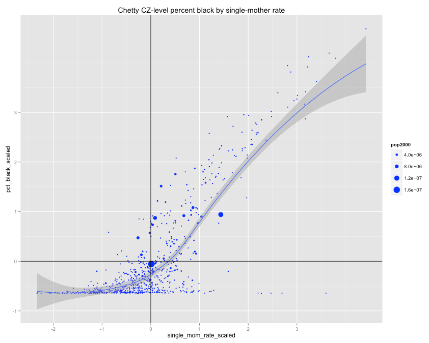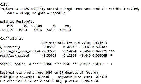 I attempted to reproduce his results based on his brief description, but could not do so precisely. His regression algorithm may have been implemented slightly differently, he may have scaled the variables differently, he may have used a different population weights, or something, but I came up with something pretty close to 50/50 with the top-100 CZ subset and, for what it’s worth, the (scaled) single-mother coefficient was usually larger.