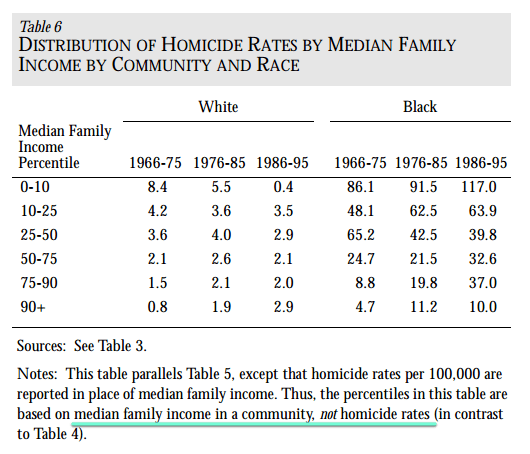 There is this claim by leftists that its not poverty per se, but rather small very poor cramped neighborhoods that create crime and that if you look at similar neighborhoods the homicide level is similar. This contradicts the data that shows that even very wealthy blacks comit more crimes then poor whites, but I guess the claim would go that wealthy blacks still tend to live in these segregated poor areas?