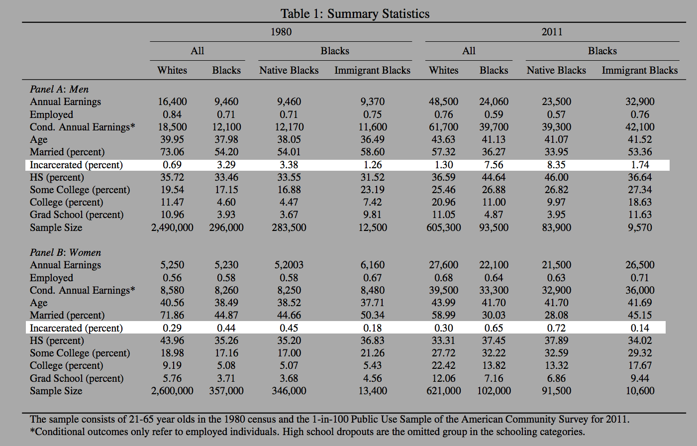 3) While there are surely moderately strong correlations between parent and child in indicators of criminality (imprisonment, convictions, etc), as in most of other characteristics, the better identified (causal) evidence indicates the effects are relatively modest and mixed. Even the higher estimates couldn’t explain these sorts of gaps and, indeed, there is some evidence the causal effects are even positive on education and related outcomes. Though I believe family structure is a strong predictor and that there’s likely some causal element to it (especially at the neighborhood level vis-a-vis spillover effects on the rest of the community), most of the fathers serving time in prison (especially the violent offenders that constitute the bulk of the population): (1) probably aren’t particularly involved in their childrens’ lives and (2) probably are not particularly good role models.