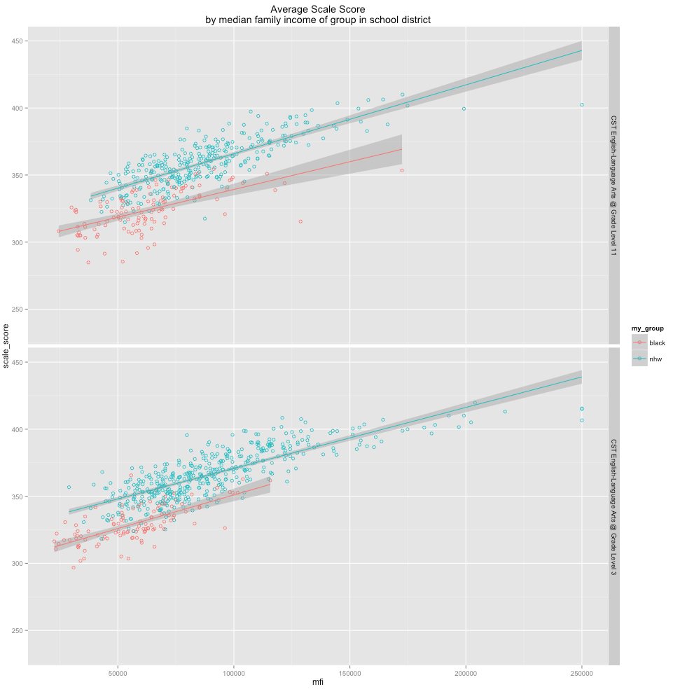 As I pointed out to you in this extended twitter thread, these individual-level differences in neighborhood income are a product of individuals preferring to live near people like them and different groups having different income distributions. In other words, if high-income blacks prefer to live near large numbers of blacks, they are likely to live near people with lower-income than whites of similar income because blacks have lower income on average. However, even in the narrow statistical sense, this explains little vis-a-vis test scores. Even in school districts where blacks have high-median incomes their test scores are markedly lower than whites in neighborhoods of similar income — increasingly so the higher income the neighborhood is. Moreover, on average blacks are actually exposed to higher income (and, more generally, higher SES) students at the school or school district level than their own individual or (group) neighborhood-level income (or SES).