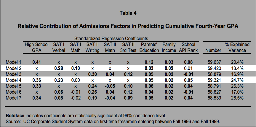 Even controlling for parent SES and California high school rank (API) the SAT I has a total beta weight of about .38 in model 2 (0.28 + .10) and a beta of .23 in model 4 with the addition of HS GPA…. but again, this is controlling for HS GPA. Unless the anti-test people are willing to take many points off the HS GPA of high SES people or people that attend less competitive schools it’s nonsensical to argue that HSGPA is an appreciably stronger predictor! Without controlling for SES/school quality measures HSGPA loses much of its validity due to its statistical bias (especially systematic under-prediction of high SES).