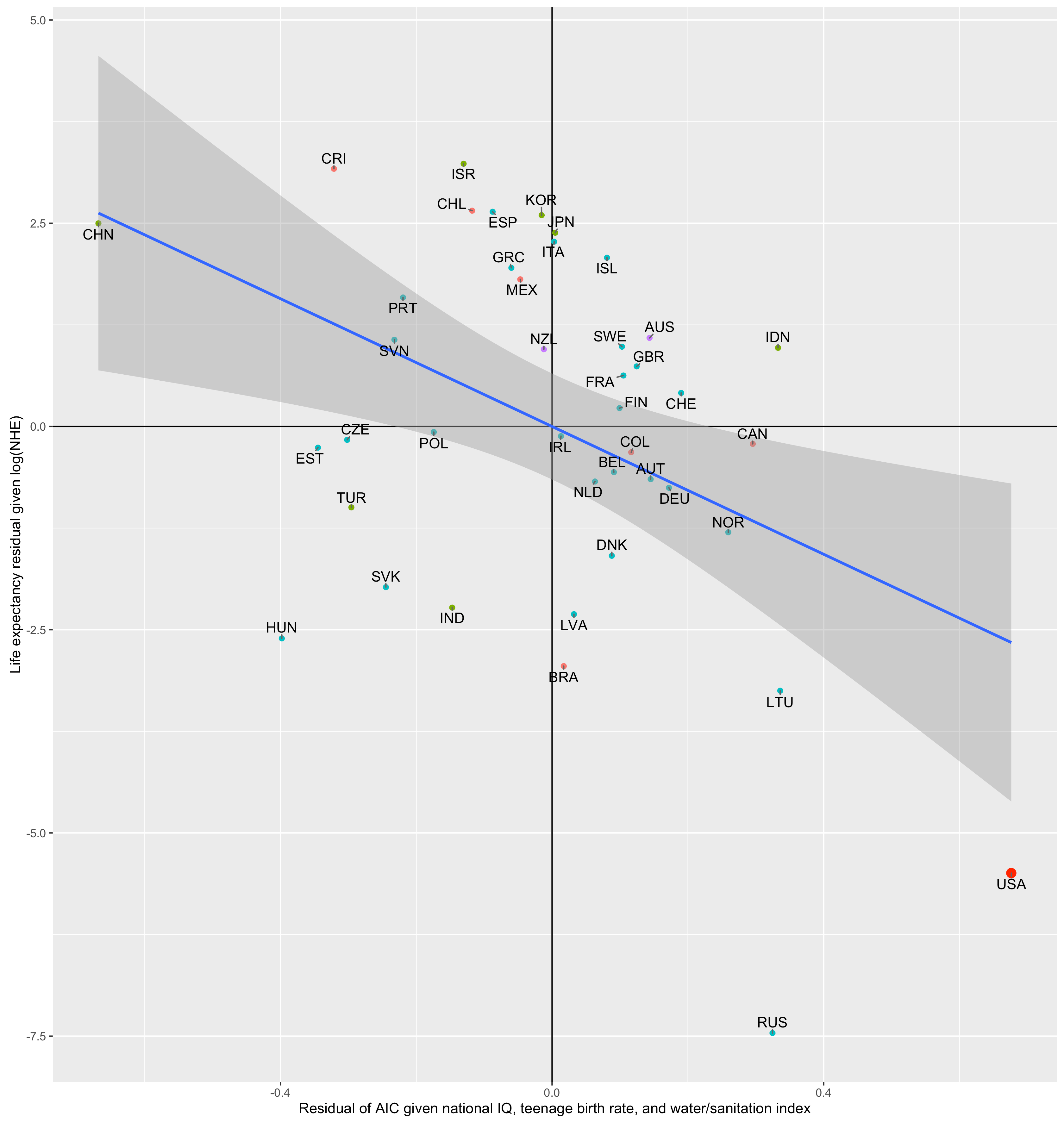 Countries with higher AIC or NHE than expected also tend to see less life expectancy than expected under the bivariate model using log(NHE).  This shouldn’t be surprising since we find these same predictors with these same countries partially mediate this same relationship in OLS and these predictors are also correlated with AIC in similar directions and magnitudes.