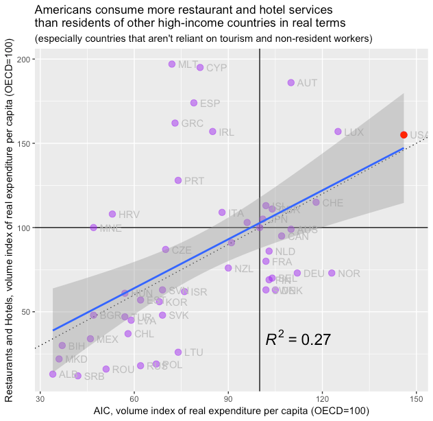 Likewise, amongst the OECD, we spend less than most on food as a share of total consumption (AIC) and consume more than most real terms (not necessarily measuring calories), and this isn’t even factoring meals at outside the home (where the US is clearly exceptionally high)!