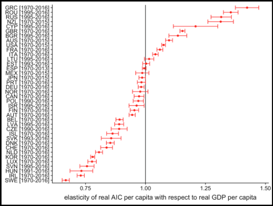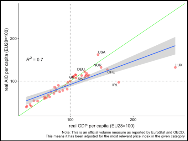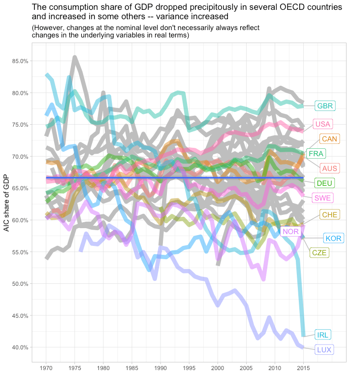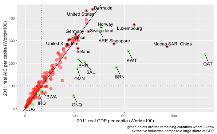 Like Gross Domestic Product (GDP), these economic aggregates are derived from National Accounts (SNA and its domestic counterpart). However, GDP and GNP are measures of production; they were designed for different purposes, and they actually measure different things. Although these measures are typically reasonably correlated, with AIC averaging around 70% of GDP, (Net) AHDI a smidge more, the relationship between production and welfare variables can vary quite dramatically within countries over time and between countries for systematic reasons. Significant differences can persist for quite a long time, and they are often explicable. Contrary to popular impression, it’s often not just transient noise.