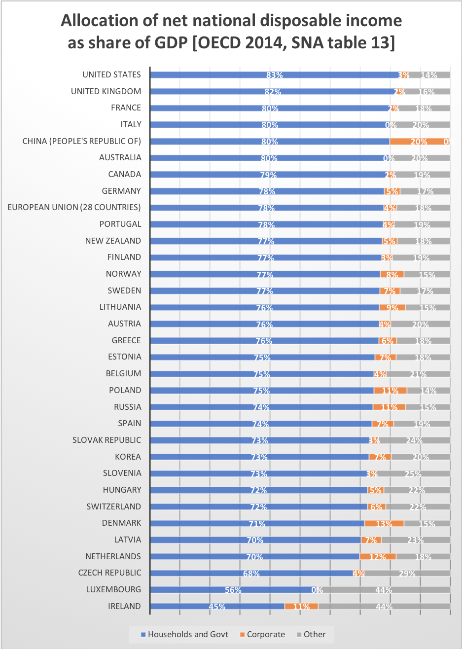 - In some countries, the corporate sectors account for a considerably larger share of GDP and/or national disposable income in the form of retained earnings (which don’t necessarily accrue to the ultimate benefit of residents).