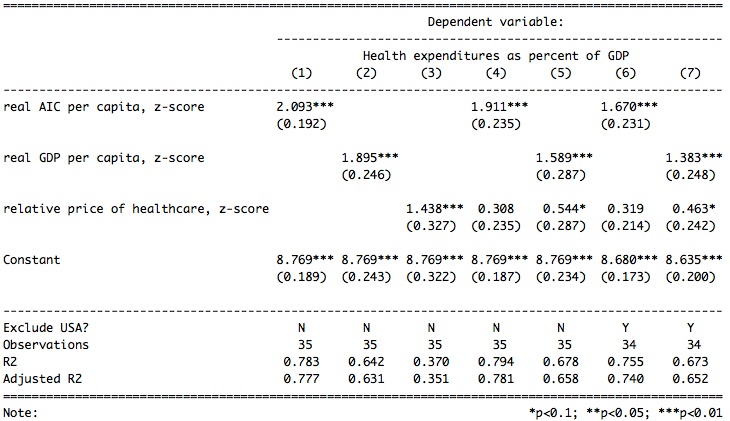 For some mildly suggestive evidence along these lines, I ran some quick regressions with OECD’s 2014 PPP benchmark. When the dependent variable is health spending as a percent of GDP, AIC mediates the presumed effect, which might be implied by the bivariate relationship between prices and health spending (model 3), and the coefficient on AIC does not move appreciably.