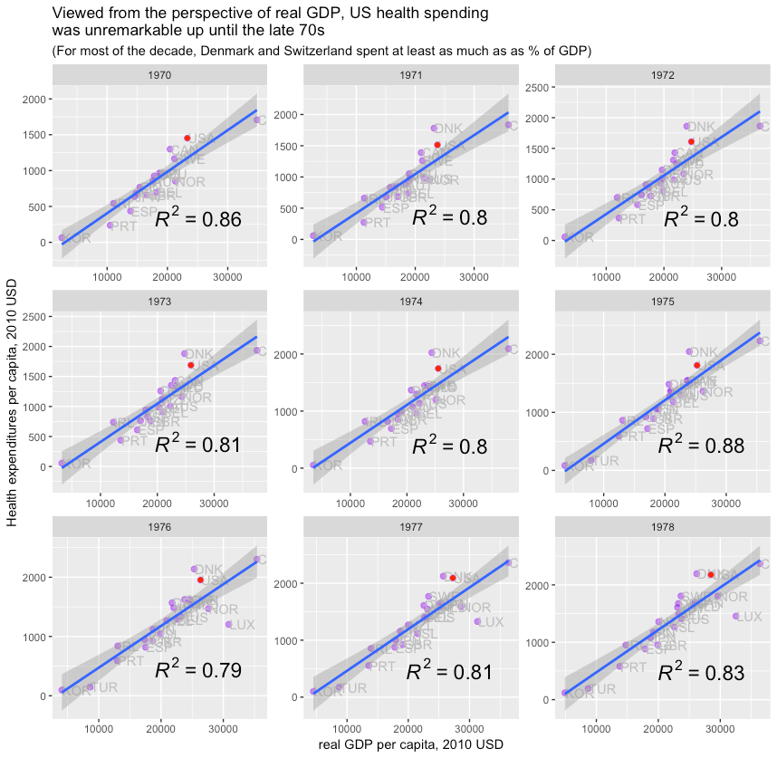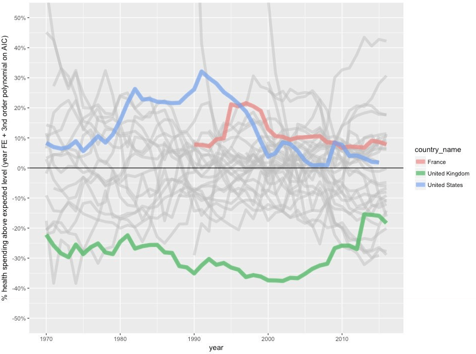 Viewed strictly from the perspective of cost containment, the most successful cost containment regime in the OECD was probably the UK (NHS), which was perhaps an accident of history. They rationed particularly aggressively and managed to hold costs substantially below what we would expect for a country of its wealth for a few more years than usual.