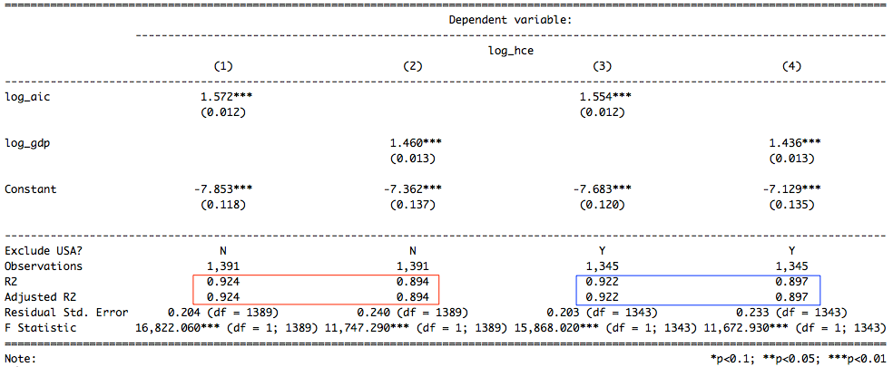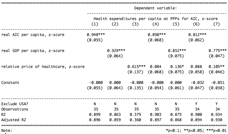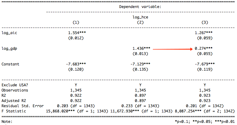 Model 3 implies that a 1% increase in AIC yields a ~1.43% increase in health spending whereas a 1% increase in everything else GDP (i.e., GDP-AIC) yields only ~0.11% increase (an order of magnitude less).