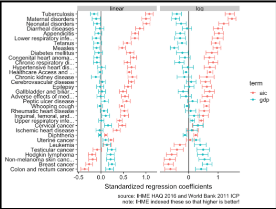 Note: The flipped associations for some cancer rates is likely a consequence of higher rates of diagnosis and longer life expectancy in rich countries. It is consistent with AIC being a better predictor of real health care consumption (quantities) and overall health outcomes.