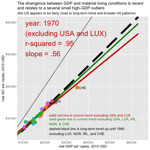 Lest you imagine this is some sort of mechanical effect, a consequence of health spending being included in AIC, we see similar patterns when we crudely subtract health from AIC!