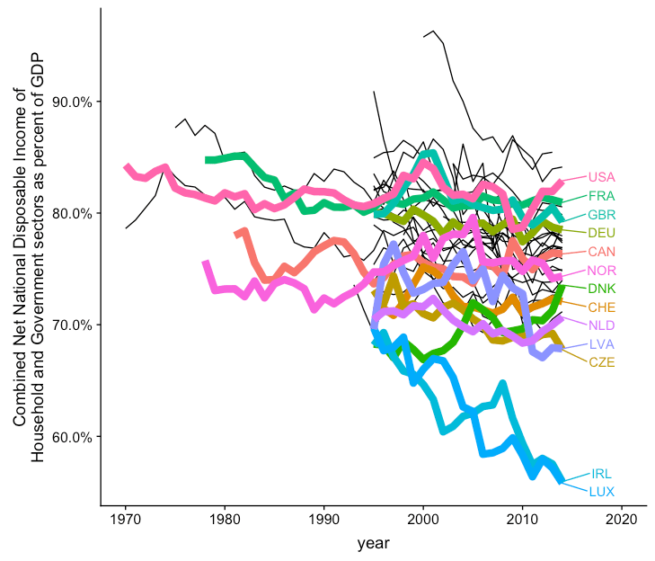 It abundantly clear that GDP that shows up as disposable income in the household sector is vastly more predictive than GDP allocated elsewhere (e.g., rest of the world and other institutional sectors within the country). Clearly, this cannot be explained as a US-only phenomenon or as a mechanical consequence of how we allocate healthcare to household consumption or disposable income.