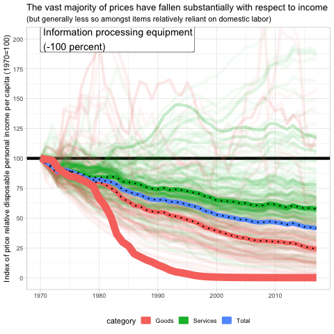 A 50% decline in price relative to income implies that the same share of household disposable income would buy twice as much, a 95% decline twenty times as much, and so on. The vast majority of prices declined and declined substantially.