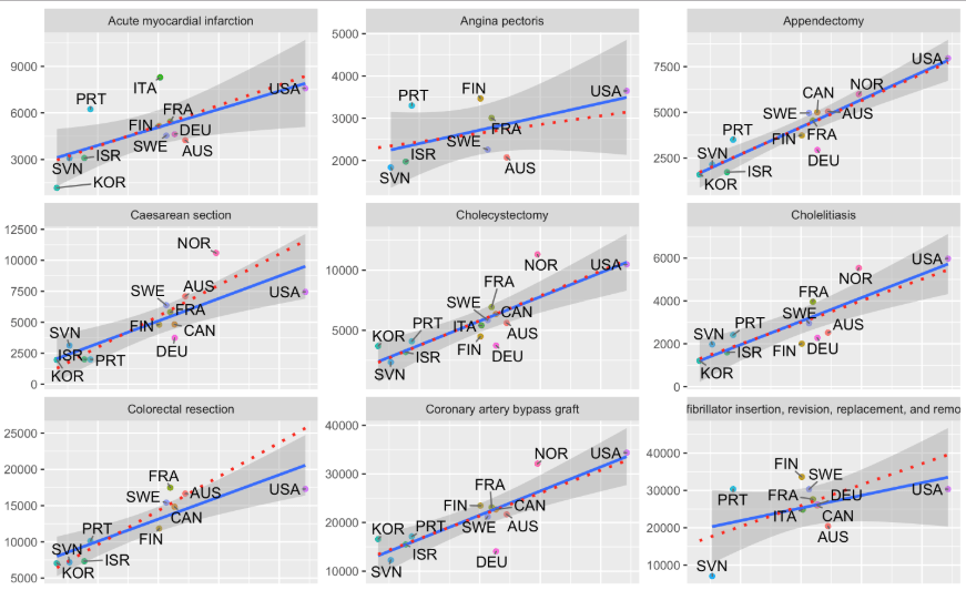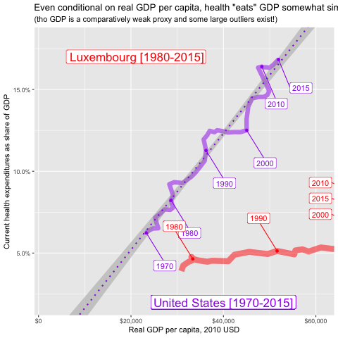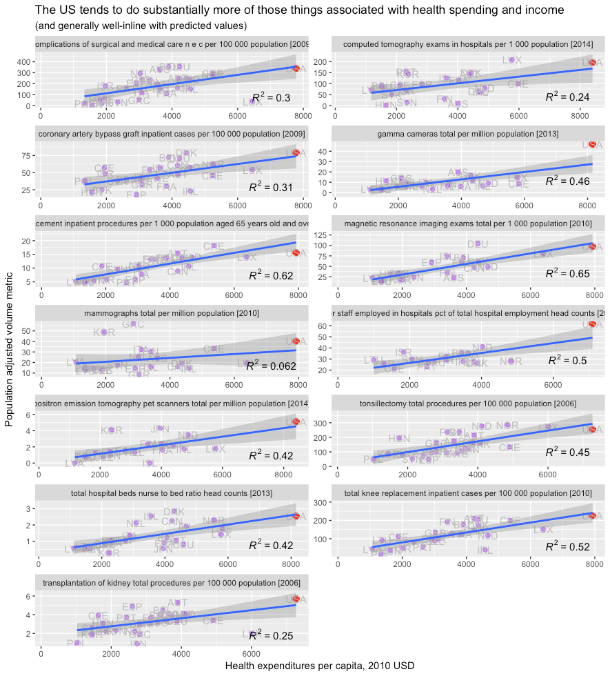 This fits essentially no high-income countries on the regression line–indeed, they increasingly diverge! If one accepts GDP is reasonably well measured amongst high-GDP countries, and that “income” (GDP) is a strong determinant of health spending, this really ought to raise eyebrows. Clearly, something is rotten in the state of Denmark.