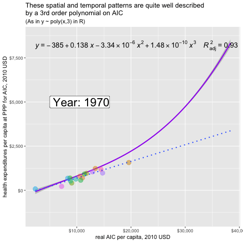 The 3rd specification above does relatively little to improve model fit and is likely over-fitting to some degree (it’s picking up defects in the model), nonetheless, it suggests changes in GDP means little for health spending without corresponding changes in AIC.