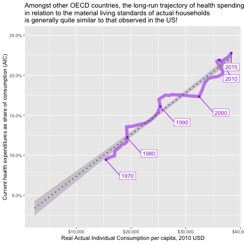 My position is national health spending is overwhelmingly determined by the average real incomes of countries’ residents in the long run (differences in propensity to consume may have a small role to play). The elasticity of national health spending with respect to reasonable measures of income or consumption is exceptionally high, averaging around 1.6 in OECD panel data, meaning that a 1% increase in income is expected to increase health spending 1.6% at a national level. Americans are exceptionally rich by these same measures, so it is hardly surprising we spend a tremendous amount on health care — far more than would be implied by simple regressions with GDP and far more than most people appreciate.