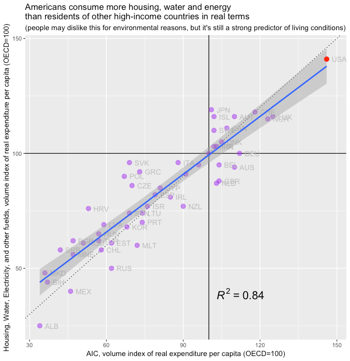 I first made this argument with Actual Individual Consumption (AIC) because it is a good indicator of material living standards and because that data was more readily available at the time. AIC is a comprehensive measure of household consumption that is adjusted for government transfers in-kind (e.g., health, education, etc.). Unlike earlier measures of household consumption (e.g., household final consumption) found in National Accounts, it does not systematically under-estimate the material welfare of social democracies where in-kind transfers constitute a substantially larger fraction of comprehensive household consumption or disposable income.