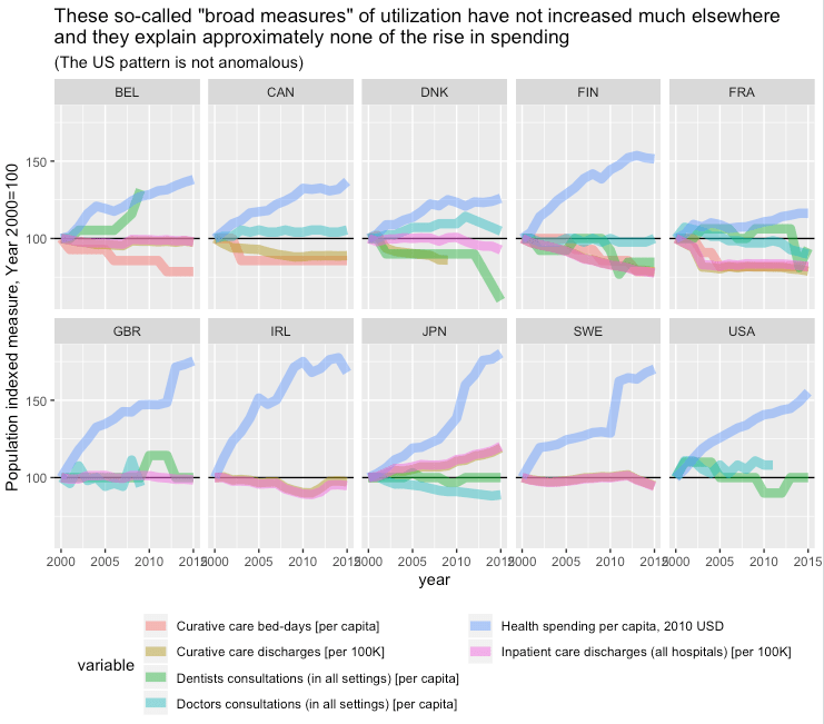 Perhaps, but then it must be through extra treatment, diagnostics, etc as opposed to higher overhead costs. This is distinct from “price” as people would typically think of it and it’d still look a lot like what I’m arguing, i.e., higher intensity/technology per encounter. While I’m not entirely unsympathetic to the idea that our particularly plaintiff (+attorney) friendly tort system leads to some unnecessary treatment and inefficiency, it seems to me the data are still generally more consistent with changes in material living conditions (e.g., US spending didn’t diverge until recently and US indicators generally following the same trend across a variety of available metrics, little change in concentration and little increase in out-of-pocket spending amongst low spenders ).