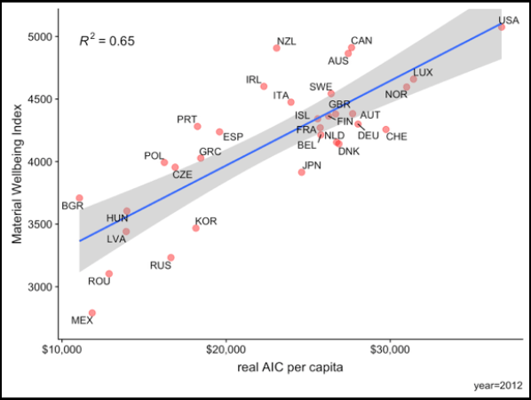 AIC and AHDI are identical to those recommended by Joseph Stiglitz, Amartya Sen, and other notable economists in the “Report by the Commission on the Measurement of Economic Performance and Social Progress” (a useful primer) and they have been part of System of National Accounts (SNA) for quite some time. These indicators have a strong theoretical basis, and they are widely preferred by experts over oft-cited production measures (e.g., GDP) when we want to compare how much resources households actually have at their disposal.