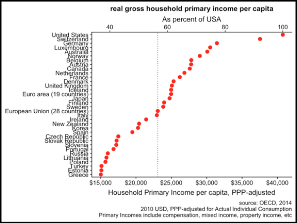 The gap in household disposable income is positively gigantic if we don’t go the extra mile and “adjust” for social transfers in-kind (STiK), which account for a large share of comprehensive income and consumption in many European countries (note: health alone accounts for more than 50% of this in most of these countries, never mind education, disability, etc…. much less discretionary income overall)