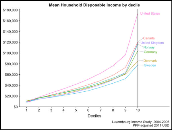 1) We don’t have good internationally comparable statistics for income or consumption at various points in the distribution. The distributional estimates are based on household surveys and they clearly miss a great deal of income and consumption (people lie and the surveys themselves questionably exclude certain things like indirect taxes, implied rent, etc). They have a lot of measurement error and they likely yield systematically biased estimates for the US (under-estimates of income for the bottom ~40% of the country). For instance, these types of surveys have lower income households in the US consuming multiples of their reported income every year on average despite the fact that they have an average net worth of approximately ~0 and little ability to borrow; higher-income households are under-reporting their consumption (when we know they aren’t saving this much either). It’s just not plausible.