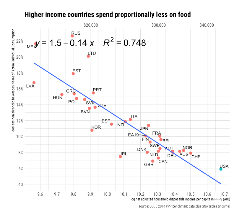 We observe very similar patterns cross-sectionally! For example, even amongst relatively high-income countries (OECD), we find the consumption share spent on food falls quite rapidly.