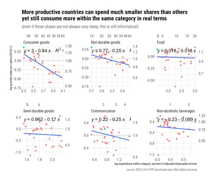 rcafdm_food_spend_relprice_and_quantityV2.pngA 1% increase in income may appear to predict a ~0.16% decline in food consumption cross-sectionally, i.e., when adjusted by PPPs for overall consumption (AIC),  but the relative price of food falls even faster than the average price of our consumption basket (~0.45%), which means that actual implied quantities consumed per capita increase by ~.28%.   This coefficient on implied quantity per capita is pretty damn close to what have observed in the US time series.
