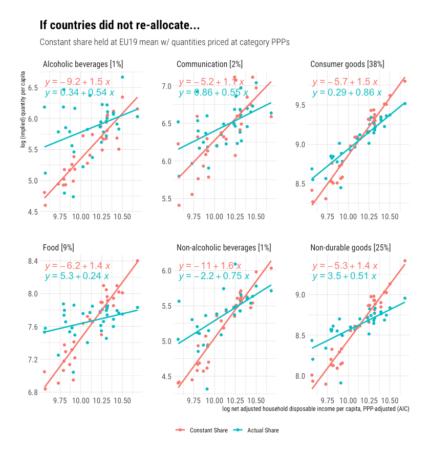 Some specific categories might increase proportionally despite falling relative prices, but our default assumption should be that household consumption decisions tend to reflect both overall (average) purchasing power and relative prices within and between categories (i.e., real shares as opposed to nominal shares).    Theoretical arguments aside, the empirical data are clear: consumption shares change and are strongly associated with real income levels.