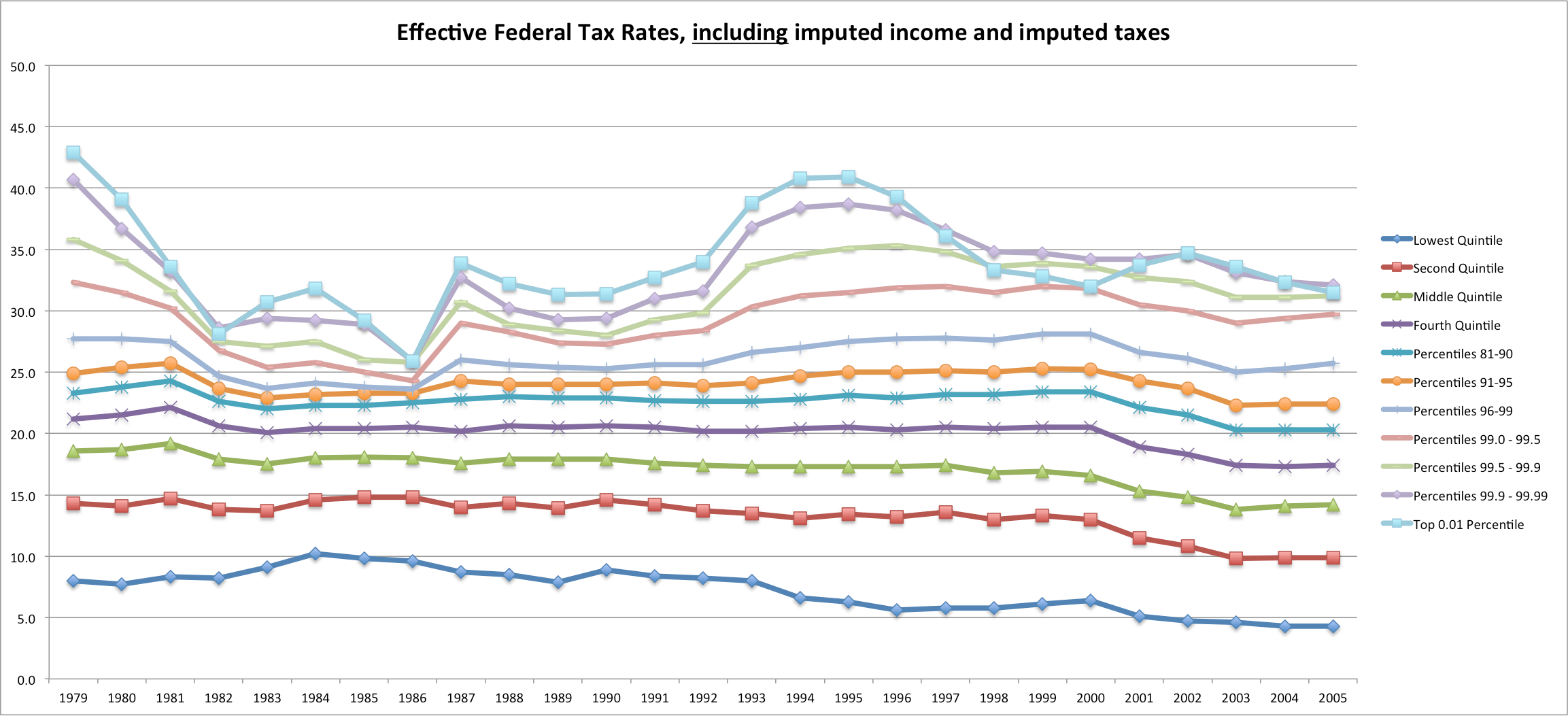 According to their calculations,the rich did pay a bit more in 1979 (the late 70s probably had abnormally high ETRs due to bracket creep and the like). That said, they also imputed 100% corporate income taxes to shareholders (mostly the rich) and the employer-portion of payroll taxes to both the numerator and the denominator [in other words, they assume that the tax payer would have had correspondingly more income and thus add both the the numerator and the denominator of this calculation]