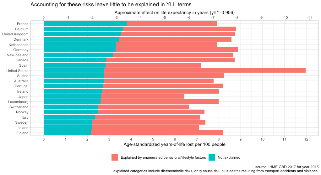The effects of primarily idiosyncratic external causes of death, such as homicide, car accidents, and drug overdoses, are quite simple to calculate from the data. Research published by CDC affiliated researchers has shown that accounting for these directly (arithmetically) explain between 30 and 50% of the gap, depending on the gender and reference group countries. These estimates are also pretty close to those provided by IHME with somewhat different methods.