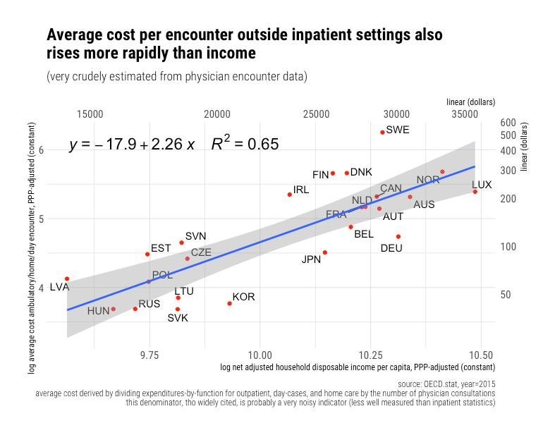 This numerator (SHA current health expenditures) includes retail pharmaceuticals, medical devices, insurance/administration, and much more, whereas the denominator just reflects people that work directly in hospitals and providers’ offices. Real incomes are rising faster than real expenditures per employee in cross-section, ergo the denominator (health services workers) must be growing significantly more rapidly than overall health spending. This is a good indication the observed excess cost growth is unlikely to be explained by the combined increases in wage rates, profit margins, health insurance, drugs, devices, and the like over and above general economic growth. All of these extra workers in hospitals and providers’ offices demand to get paid at rates that approximately reflect the prevailing real wage in each country.