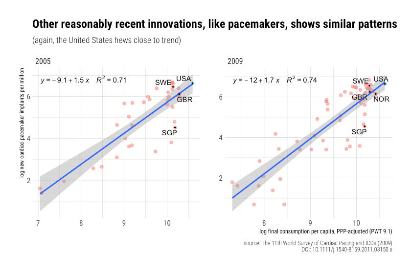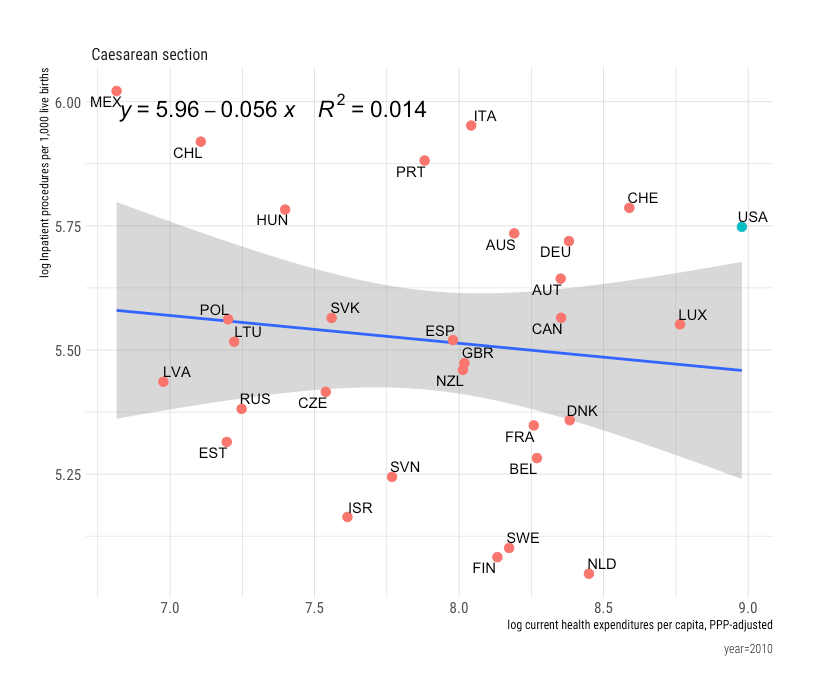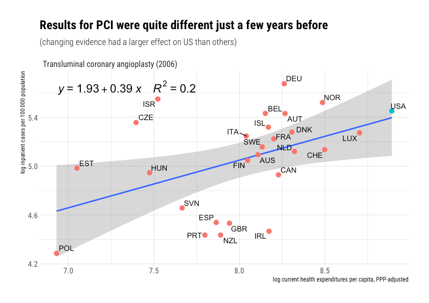 - Available OECD.stat data for US procedures are inpatient only. A non-trivial share of some of these procedures are being performed on an outpatient basis, and the United States is likely leading the charge here (tends to be cheaper, faster recovery, etc.)