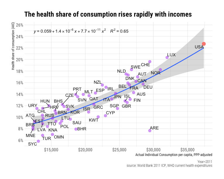 Comparable patterns are found with PPP benchmarks in international (OECD) cross-section vis-a-vis potential consumption per capita and health share of income. (You may also observe that the United States, the blue point, has much higher potential consumption after adjustment for purchasing power and that it’s generally very close to trend)